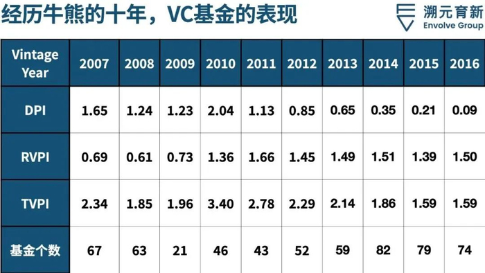 我们从一些公开数据中就能很好地了解到VC基金的宏观表现。在下方表格里,我们用2007年的数据为例详细展开一下。这个起始年份的选择还挺有意思的,因为首先,已经过去了接近15年,按理说大部分的资金都应该归还给LP了,但它的RVPI中还是有些存量。