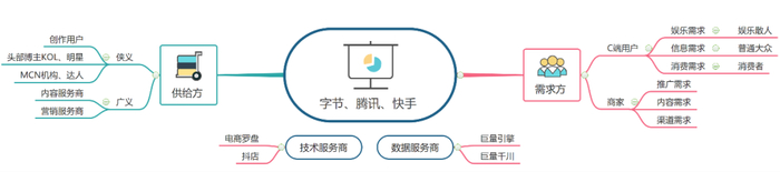 狭义来讲:短视频行业的中游就是以字节、腾讯快手为首的技术平台提供方,作为桥梁连接供需双方。