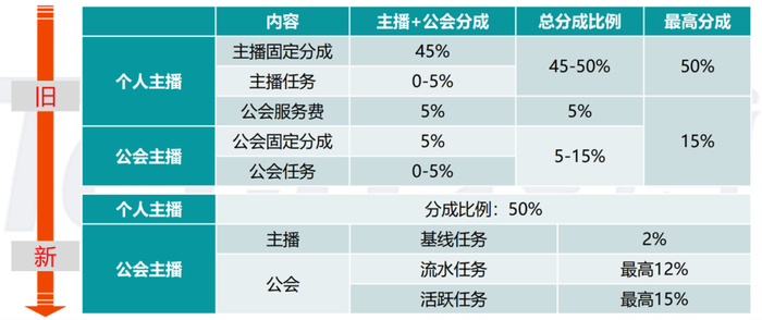 分为有公会和无工会两种,根据Mob研究院数据,目前新模式下无工会的主播分成在50%左右,有公会的主播根据个人协议分成,要低于无工会的主播,不过流量运营要更强。