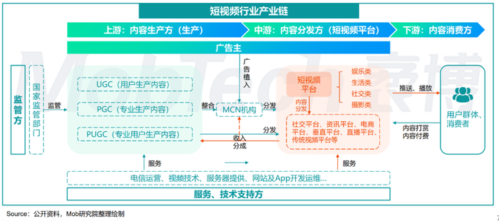 短视频的参与方,按照传统经济行业,也可以划分为上游、中游和下游。