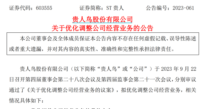 贵人鸟称,本次优化调整公司经营业务,是公司经营管理层综合考虑公司的实际发展情况、当前和未来的内外部机遇及挑战,以增强公司可持续发展能力和持续盈利能力的战略定力为指引,因应形势变化,做出的提升和优化公司产业布局和业务体系的重要决定,有利于公司集中资源发展核心业务,解决公司资源、资金、管理等综合实力不足与不同业务发展需要之间的矛盾,是公司明确主业、聚焦主业、构筑核心竞争力和可持续发展能力的极其重要的举措,是公司长远健康发展的基础和核心所在,为公司参与和助力新时代东北全面振兴提供重要保障。