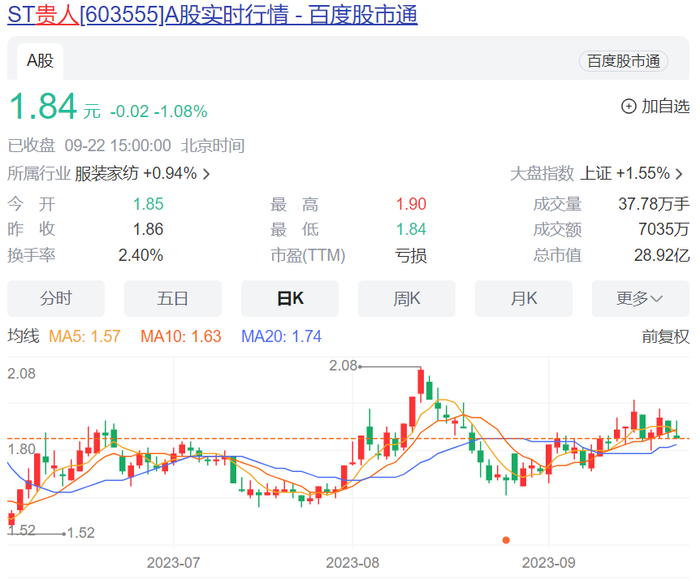 截至9月22日收盘,ST贵人股价报1.84元/股,总市值为29亿元。