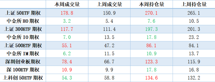 成交持仓方面,除中金所的品种成交量有所下跌,其他期权品种的成交量均有所上升,大部分品种持仓量有所下降。