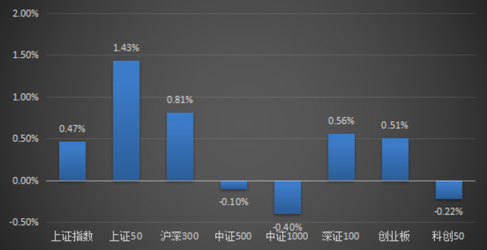 截至22日收盘,上证50收2550.98,周涨跌幅1.43%,沪深300收3738.93,周涨跌幅0.81%,中证500收5698.82,周涨跌幅-0.10%。科创50 收 882.88,周涨跌幅-0.47%,创业板指收2013.34,周涨跌幅0.53%。