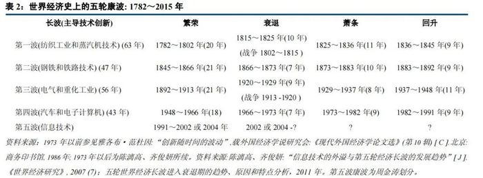 但目前是衰退周期还是复苏周期?这个边界较难判断,因为它们的界线是技术创新活动的底部拐点,而且是一次为期50年(可能越来越短)的颠覆性的新技术的起点。