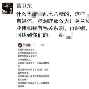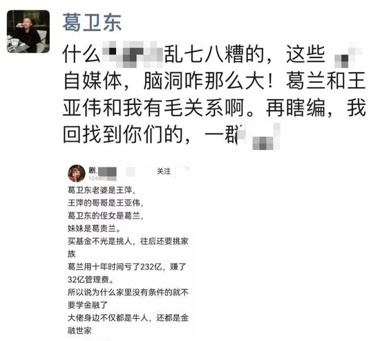 葛卫东为何会“怒骂”自媒体?近日,有自媒体称“葛卫东的老婆是王亚伟的妹妹,葛兰是葛卫东侄女,买基金不光是挑人,往后还要挑家族……大佬身边不仅都是牛人,还都是金融世家。”
