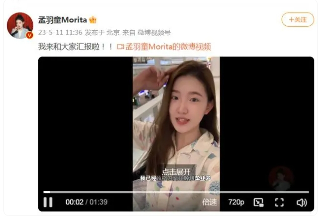 5月11日,孟羽童在个人微博发视频回应从格力离职。
