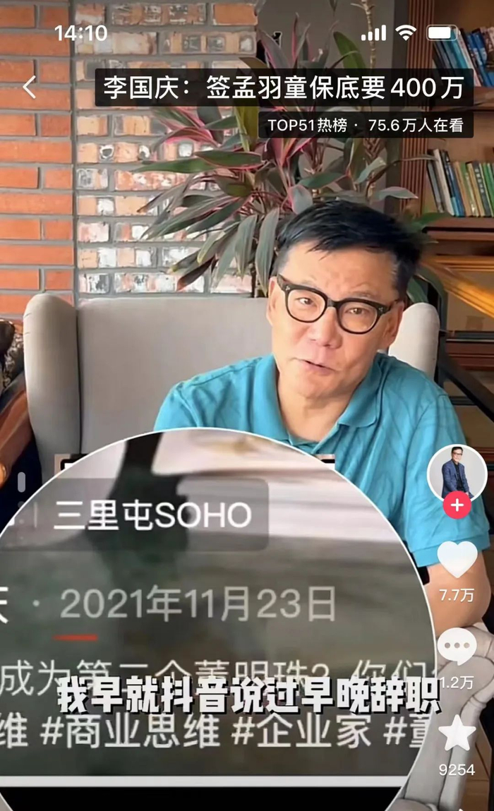 李国庆称:“我早就在抖音说过孟羽童早晚辞职,孟羽童董明珠为了孵化成网红有点过了。什么下一个董明珠了,董明珠还说把她按照管理层来培养了,结果去年下半年开始就直播间露面很少了,孟羽童还去市场部轮岗了。”