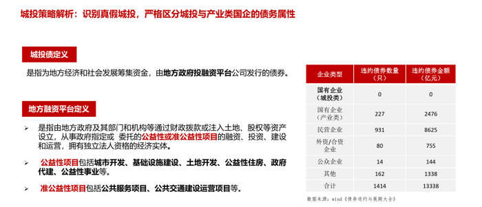 该怎样判断城投?可以用一个词来衡量叫:公益性程度。公益性项目包括城市的开发、道路基础设施建设、保障房、土地开发、政府代建等。从城投债券的历史来看,目前城投债券的违约率是0,实质违约是0。