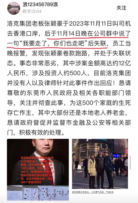 “我要走了,你们也走吧”。近日,网传私募机构洛克资本老板张颖豪在公司群里留下这句话后,便失联了,疑似跑路。