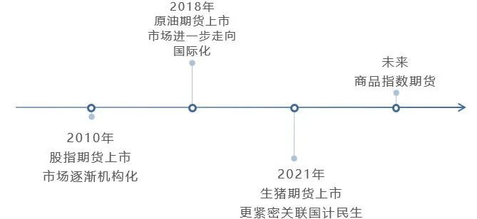 在2010年以前,期货市场还是一个高度散户化的市场。2010之后,随着股指期货的上市,带来期货、套利这样的期货投资者,市场逐渐走向成熟化、机构化。2018年,原油期货上市,市场进一步走向国际化,未来,商品指数期货,南华商品指数等令人期待。