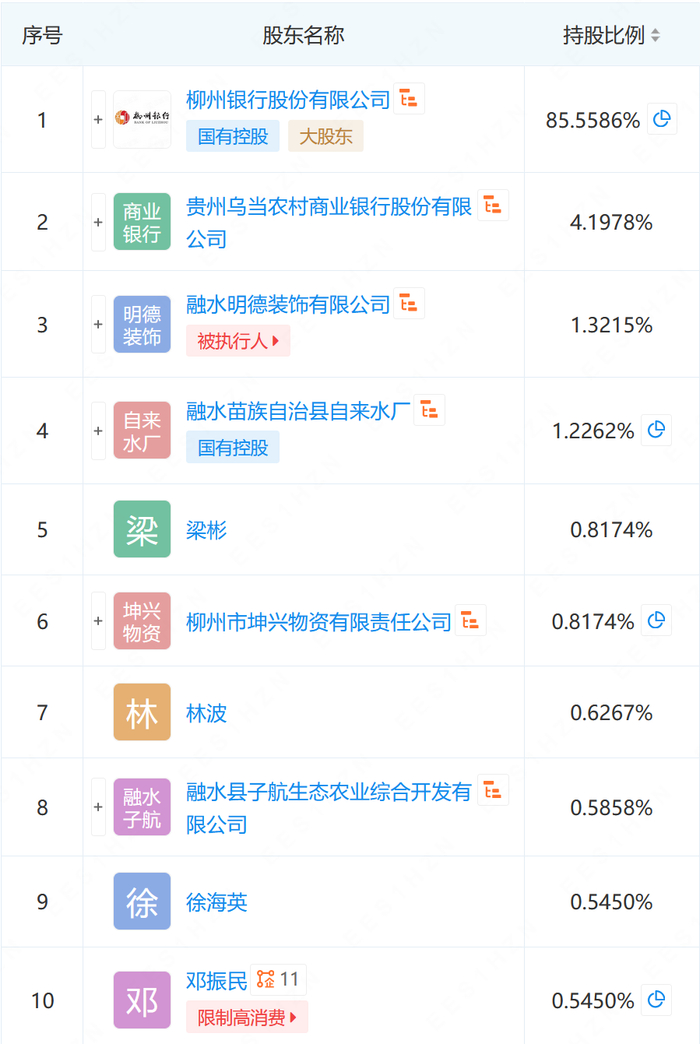 据公开资料,广西融水柳银村镇银行股份有限公司成立于2010年12月25日,注册地位于广西融水县人民路会展中心。这家村镇银行解散之前,其大股东为柳州银行,持股比例为85.6%。