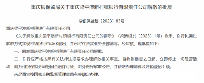 被解散村镇银行再添一例