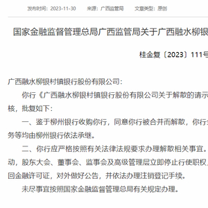 11月30日,国家金融监督管理总局发布公告,广西融水柳银村镇银行宣告解散。