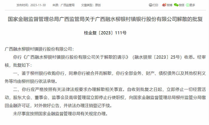 公告表示,鉴于柳州银行收购该行,同意广西融水柳银村镇银行被合并而解散,其全部业务、财产、债权债务以及其他权利义务等均由柳州银行依法承继。
