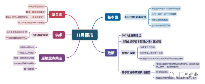 11月资金面整体偏紧,NCD与MLF倒挂。月中万亿增发国债开始落地,预计年底之前发行量达5000亿,对资金面形成一定冲击;央行大幅投放1.45万亿MLF(净增6000亿)补充流动性缺口,不过短期内降准、降息的预期落空;临近年末,商业银行考核压力和现金需求增加,预计资金面波动加大。