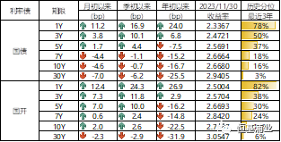11月债券市场在基本面修复弱于预期、增发国债逐步开始落地和宽地产政策等诸多利多、利空因素的影响下短端波动上行、中长端震荡走低,无风险利率走出了倒N字行情,收益率曲线走平。全月来看,1年期国债收益率上行11.2bp至2.34%,10年期国债收益率下行4.6bp至2.67%。