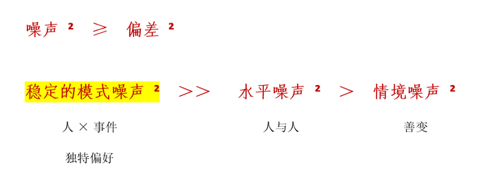 噪声的影响不亚于偏差,在噪声内部,影响最大的是稳定的模式噪声,其次是水平噪声,情境噪声最小。