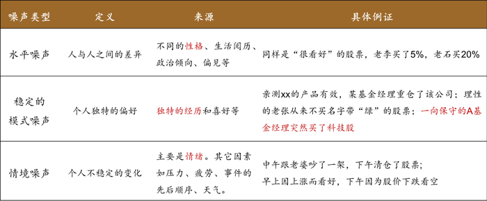 三类噪声的划分,值得我们借鉴到投资中。表中列举了具体的噪声案例: