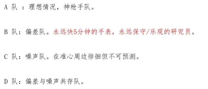 人们理想中的决策,应该都是A队这样的神枪手。但现实中,经常会有B这样的偏差队,比如永远快5分钟的手表,或永远保守/乐观的研究员。