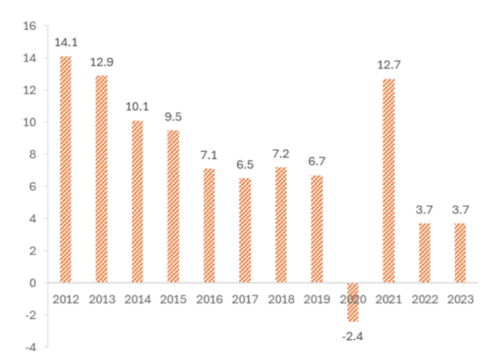 图4 2012-2023年农民工外出务工劳动力收入同比变化(%)
