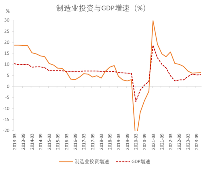 图9 2013-2023年中国制造业投资与GDP增速(%)