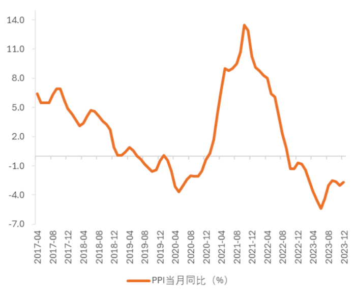 图2 中国PPI同比增长幅度(2017.04-2023.12)