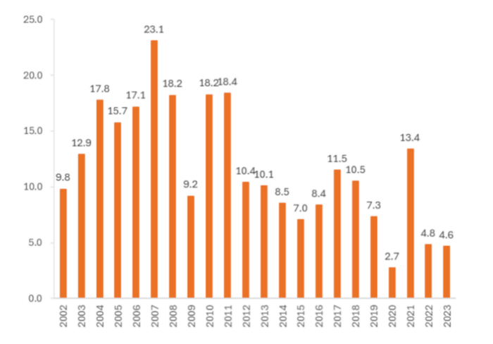图5 2002-2023年中国名义GDP增速(%)