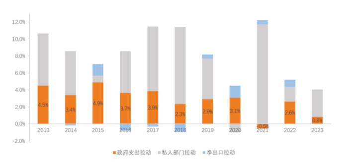 2023年政府的两部分支出合并之后,增速为2.4%,而私人部门投资与消费的增速为5.1%。由此可见,2023年政府支出的增速低于全社会平均水平、低于私人部门的增长水平,政府部门的需求收缩对需求不足现象有明显影响。作为对比,2013-2019年期间,政府支出增速平均比私人部门支出增速高1.3个百分点。