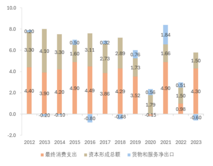图6 2012-2023年三大需求对中国GDP的贡献(%)