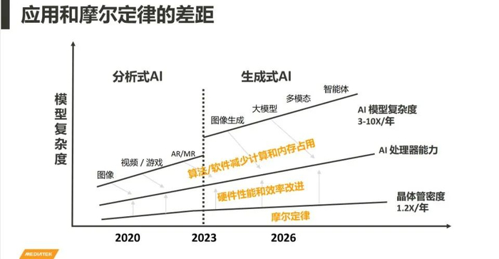 陆忠立:摩尔定律是18个月,或者是每24个月它的晶体管密度就会成倍,但是到了先进制程我们看到整个趋势是变慢下来,以目前来看的话,大概每年可能增长20%到30%。从应用层面来看,联发科技也大概做了一些统计,以端侧AI模型的复杂度来讲,每年增加的幅度可能都是两倍、三倍,甚至是十倍,所以看到这两个的确是有蛮大的差距。