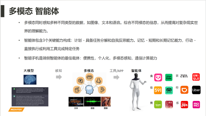 基于这些新的模型,也有一些新的做法。主要还是集中在刚刚讲的两方面,一些是硬件的演进,突破算力。第二个非常重要,甚至有时候更重要的是在算法上面的改进。这些算法的改进,就让这些多模态的大模型能够在端侧执行。第三步就是到智能体的部分,除了刚刚讲的能够多模态进来以后,还能善用工具或者善用APP执行任务。