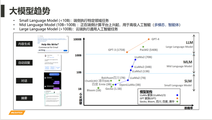 当然,端侧有这些好处,但并不是说端侧会完全取代掉云侧,云端大模型有它不可取代的优点,比如说准确率很高,可以处理复杂的事情,特别是一些需要全局资讯的工作还是需要云端模型来做。