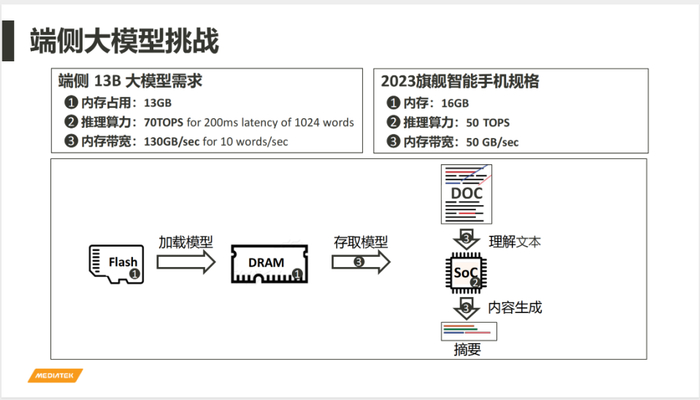 如果在端侧跑一个130亿的大模型,它需要的算力、内存容量、内存带宽都超过目前旗舰机能够提供的能力。