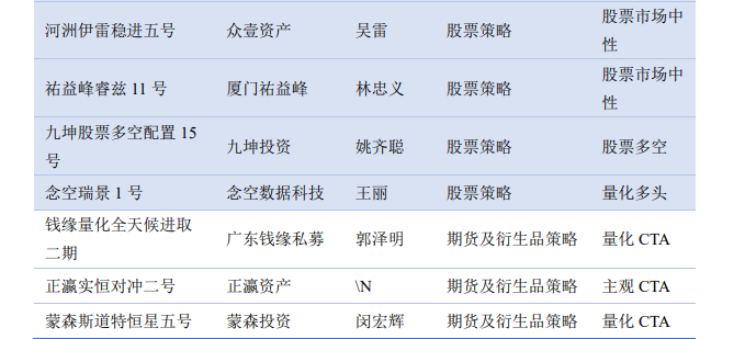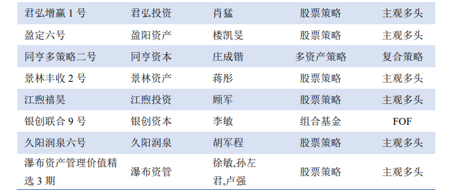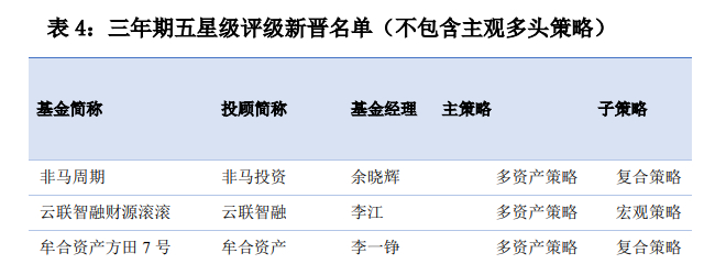 因成立较早且存续超过五年的产品多为股票策略,所以从结果看历次五年期五星级上榜产品多为主观股票多头策略。为了观测更多其他主/子策略优秀私募和产品,本报告增加了三年期维度的五星级新晋/降级/连续12个月上榜名单。因上榜产品中主观股票多头产品较多,而该策略优秀私募已在五年期维度获得较多观测,以下三年期维度榜单均展示除主观股票多头策略外的其他策略产品。