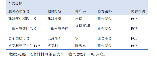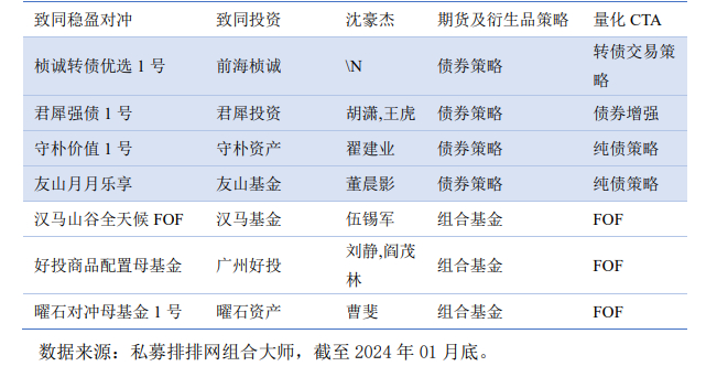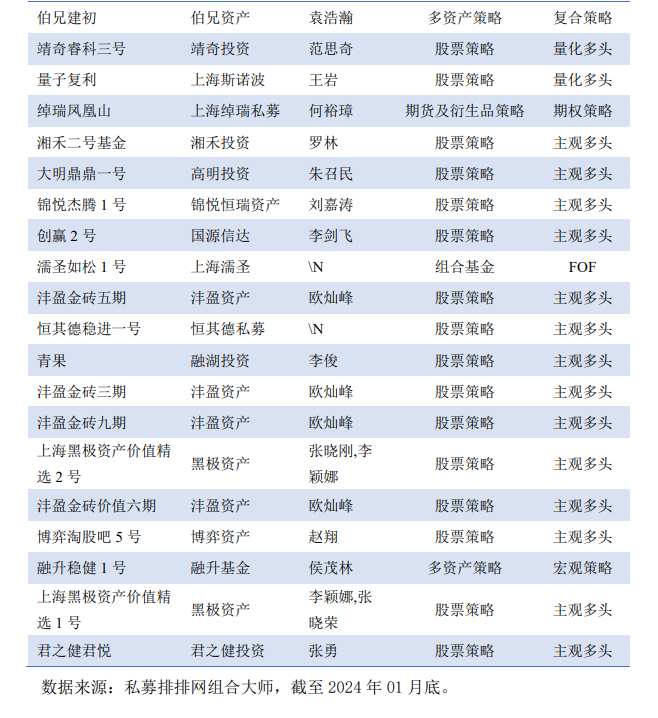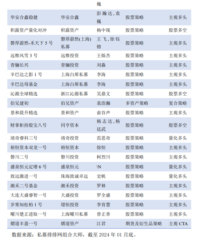 2024年01月上榜产品57只,对应私募44家。具体表现参见下表: