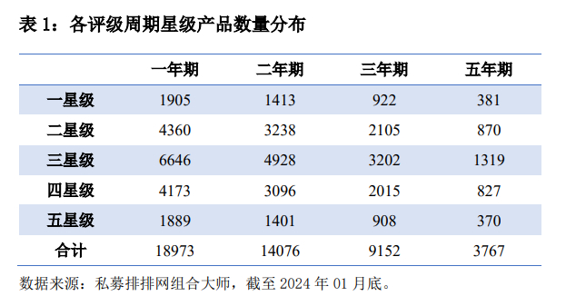在此背景下,下面统计分析存续基金融智评级情况,2024年01月,共有18973品参与一年期评级,14076品参与二年期评级,9152品参与三年期评级,3767产品参与五年期评级。具体星级分布数据如表1: