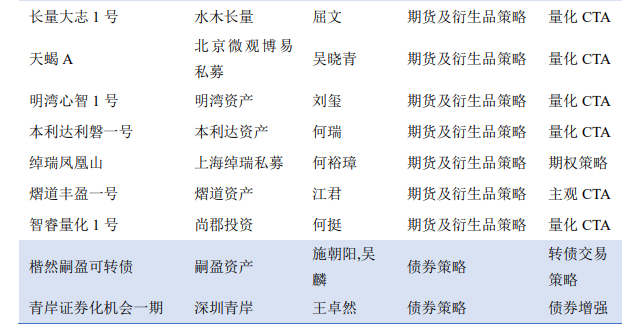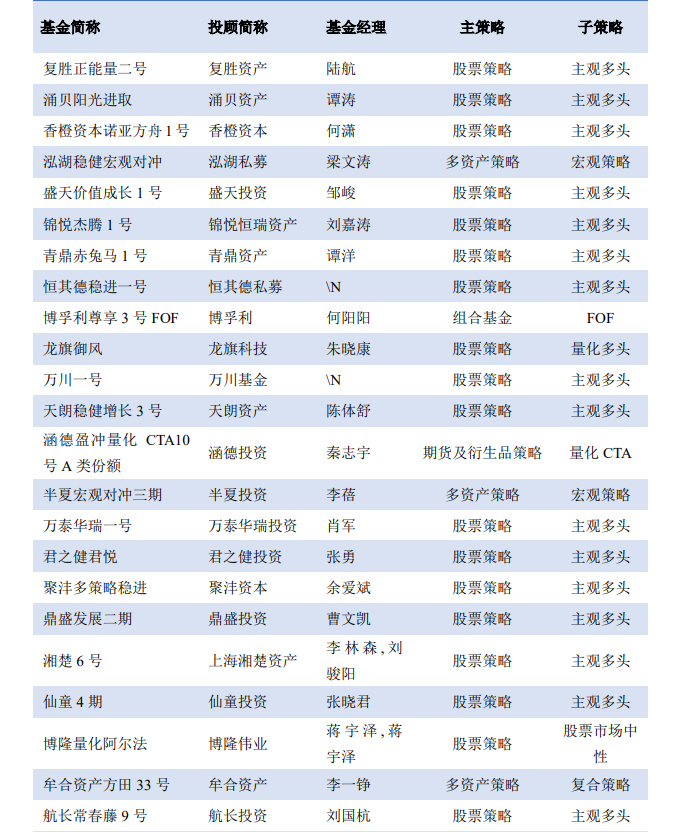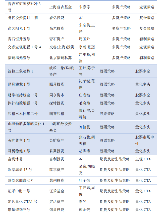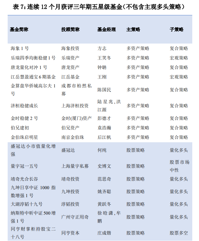 表7为连续12个月获评三年期五星级基金产品的名单,因本报告各表上榜产品较多,若同一私募的同一基金经理有多只产品上榜,只选取收益率最高的一只代表产品展示;此外,数量过多的榜单各策略筛选排名靠前的部分产品展示。