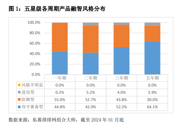 融智风格方面,从图1可以看到大部分评为五星级的产品可以做到攻守兼备,表现不错。和2023年12月相比,各年期产品攻守兼备型产品占比均有所下降,其中一年期产品占比下降较为显著为1.9个百分点。其次,各周期防御型产品占比,,二年期及三年期产品防御型产品占比有所下降,但下降幅度并不显著,一年期及五年期产品占比有所上升,一年期产品占比上升较为显著为1.7个百分点。就进攻型产品比例而言,除了五年期产品有所下降外,其余各年期产品占比均有所上升,其中二年期上升较为显著为3个百分点。