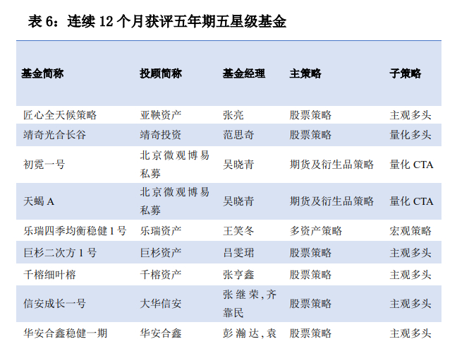 随着评级周期的滚动,各榜单均有一定流动性,不过仍有部分私募及产品长期表现稳健,连续多个月摘得五星级评级。下表是连续12个月获评五年期五星级的产品名单。
