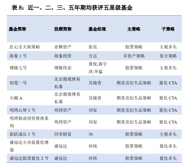 上文观测维度筛选出的是长周期(近三/五年)同策略表现较好的五星级产品,而其中部分产品近一、二年表现却并不突出,没有跑赢同期基准。所以为了观测长、短期都持续表现较好的产品,本报告还增加了近一、二、三、五年期均获评五星级的产品名单。