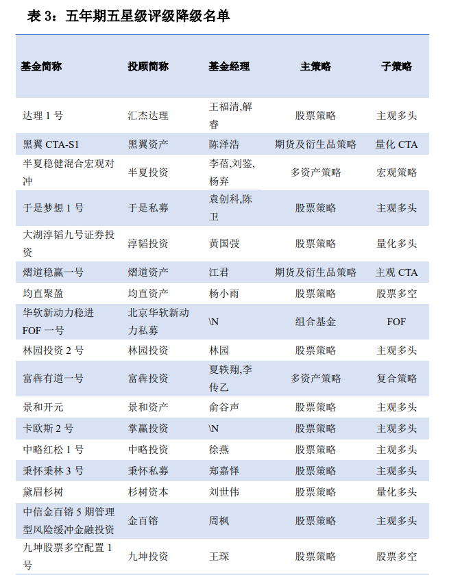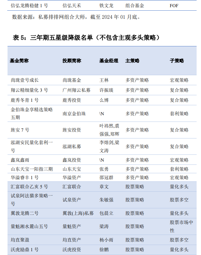 下面表4和表5分别是2024年01月三年期五星级产品的新晋和降级名单。因本报告各表上榜产品较多,若同一私募的同一基金经理有多只产品上榜,只选取收益率最高的一只代表产品展示;此外,数量过多的榜单只展示前30只产品。