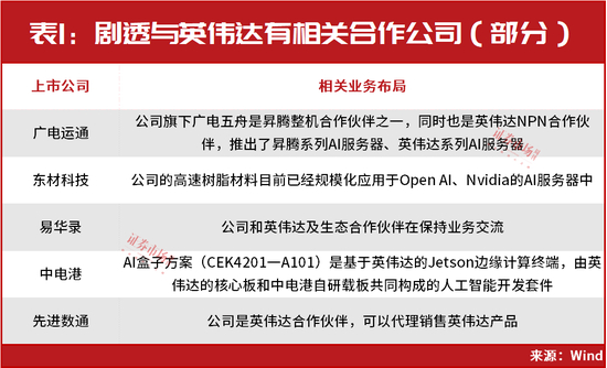 或受上述多重因素刺激,近期,上市公司与英伟达的业务合作情况备受投资人关注,有不少公司也因此进行了剧透。如据罗博特科表示,英伟达系公司参股公司ficonTEC重要的客户之一,双方在晶圆测试设备及光耦合设备领域有着重要合作,并已有设备交付应用及取得后续订单。另外,广电运通、东材科技、易华录、中电港、先进数通等也在近日剧透与英伟达相关的业务合作等情况(见表1)。