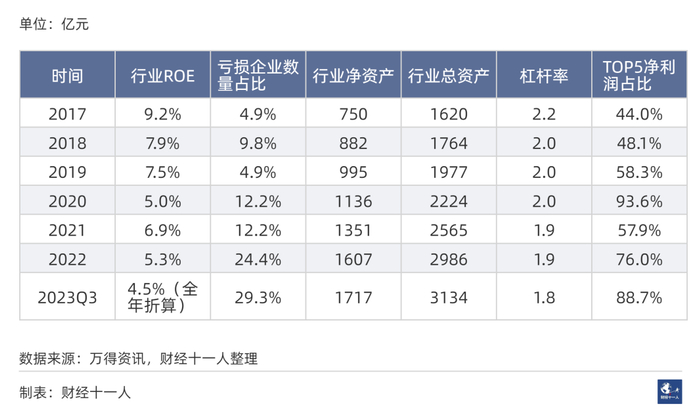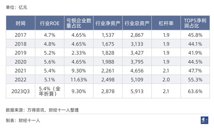 2018年、2019年是行业困难时期,前5名公司的净利润在行业总利润中的占比超过100%,即其他公司净利润之和为负数。2023年,前5名净利润占比高于2020-2022年,透露出行业景气度下行。