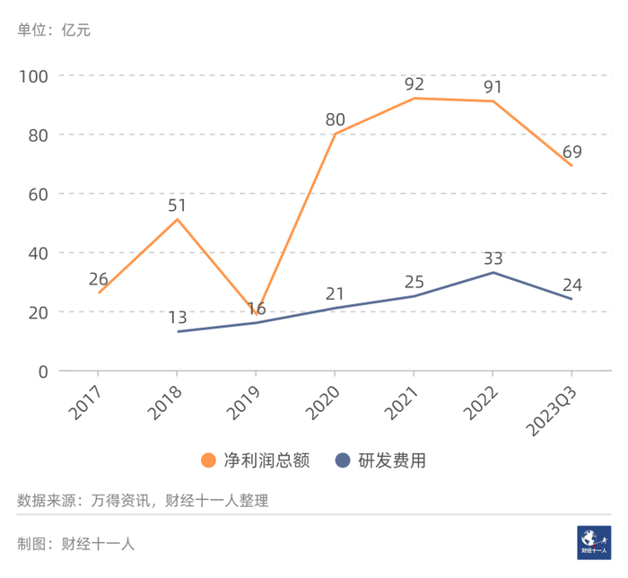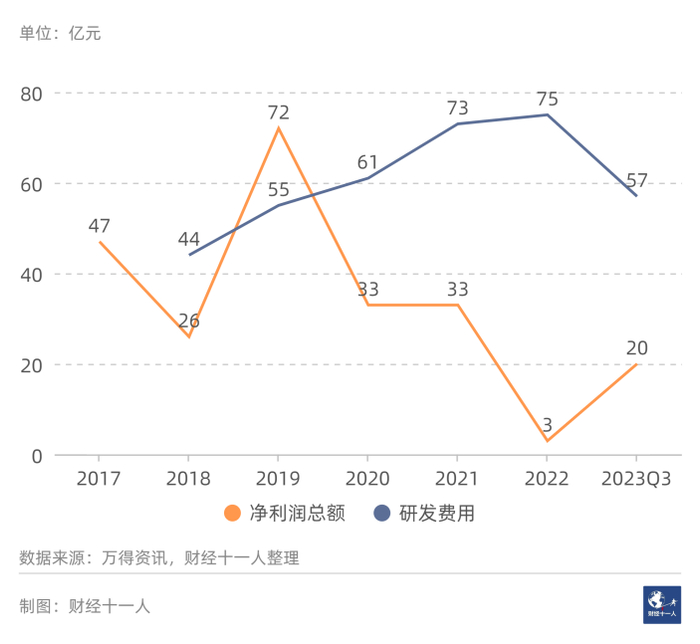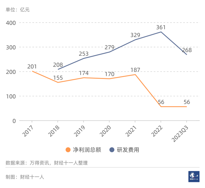 行业有46家样本公司,2024年1月20日总市值为2668亿元。图9是2017年以来每年的行业净利润总额以及研发费用总额。2017年到2022年,行业净利润总额从47亿元,降低到3亿元。