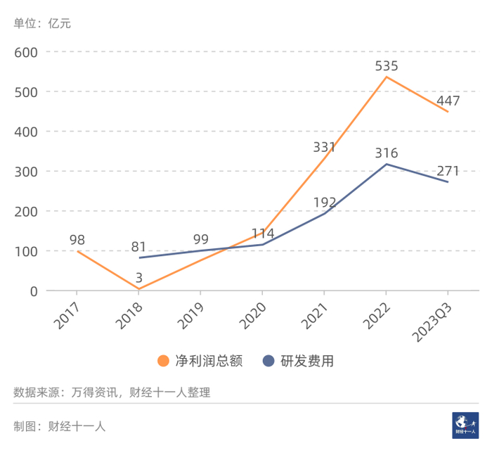 2018年到2023年三季度,行业研发费用都大幅高于净利润。这些年的研发费用加总为732亿元,研发净利润比为167%,在十大看好行业中排名第四。