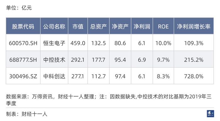 以下是按照2024年1月20日收盘价,行业市值排名前三名的基本情况,其中总资产、净资产、净利润是2023年三季度数据,净利润增长率的对比基期为2017年三季度。下文其他行业的此部分也是如此。