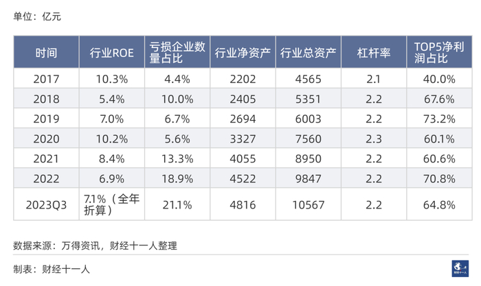 2022年和2023年,行业前5名基本稳定,它们在行业总利润中的占比大幅上升,不是因为前5名的盈利大幅提高,而是由于行业整体利润下跌到不足2021年的一半。