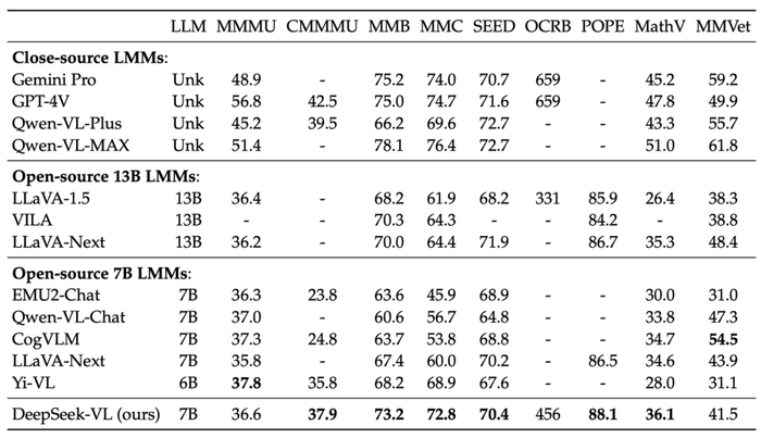 同时,DeepSeek-VL在公开数据集榜单的表现上也可圈可点,在7B上超越同规模(7B 参数)的 EMU2-Chat/Yi-VL 等模型,甚至超过更大规模(Vision+LLM总参数量17B 参数)的 CogVLM。在1.3B上更是超过当前2.7B尺寸模型 (MobileVLM V2)。