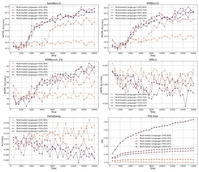 DeepSeek-VL与通过直接的多模态输入对预训练的大型语言模型(LLMs)进行微调的传统方法有所不同。相反,我们提倡使用集成视觉和语言数据的方式对LLMs进行预训练。我们采用了一种倾向于语言的训练策略,在保持语言上的卓越性的同时,也赋予模型强大的多模态理解能力。我们发现,较高的语言比例(高达70%)能在保持语言能力同时实现强大的多模态理解能力。这一策略旨在开发跨越两种模态的更深层次、共享的表示,从而增强模型综合能力。